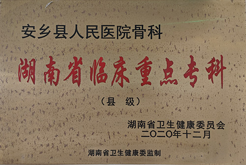 安乡县人民医院骨一科是湖南省县级医院临床重点专科。现有主任医师1名,副主任医师2名,主治医师3名,硕士研究生1名,住院医师1名。科室开放床位56张,年手术台次1500台左右。拥有现代化骨科专业百级手术间2间,配套骨科手术牵引床,C型臂X线机。已开展创伤、关节、手显、足踝、运动医学、骨病等多项先进技术,对多发重症创伤、复杂髋、膝关节置换、手显治疗有丰富经验。