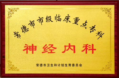 神经内科对脑血管病、癫痫、眩晕、脱髓鞘病变、重症肌无力、中枢神经系统感染及神经内科其他危重疑难病症有较高的诊断与治疗水平。科室特色治疗为:脑梗死超早期静脉溶栓,脑血管造影检查及介入治疗,脑出血的微创颅内血肿清除术治疗,蛛网膜下腔出血脑脊液置换术,位置性眩晕的手法复位,中风的早期康复治疗等治疗。2016年率先在常德市县域医院开展静脉溶栓治疗,每年抢救急性脑梗死病人百余例,并由此于2019年获得安乡县科技进步三等奖。2019年开展脑血管造影检查及介入治疗,为安乡县县域内能唯一开展的单位。